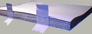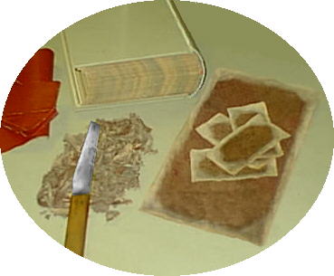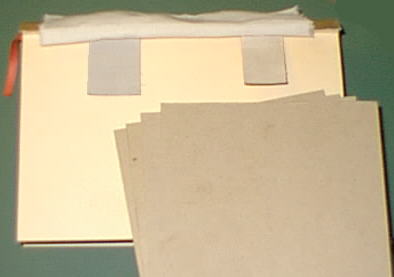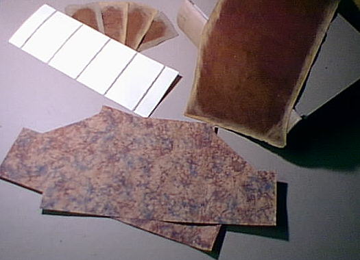 In addition, a piece of card (spine liner) is fitted with lengths of cord to simulate the effect of raised cord sewing on a book spine.Carefully measured and cut decorative papers are also prepared. | |