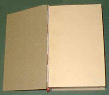 The sewn text-block is then rounded at the spine, backed with cloth and paper, and is now ready for the new boards to be attached.Note: the use of four boards per volume. The bulk of these text-blocks require thicker boards, so the cloth tapes and backing cloth flaps are sandwiched between two relatively thin boards.This method of construction is called 'split boards'. |