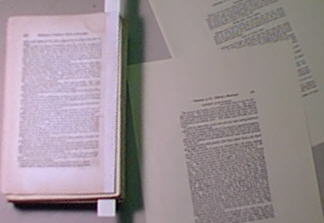 Cover remnants were removed and the text-block given a complete restoration. The client was able to supply (via e-mail attachments) graphic files of the four missing pages from another copy. These pages were then printed graphically... |